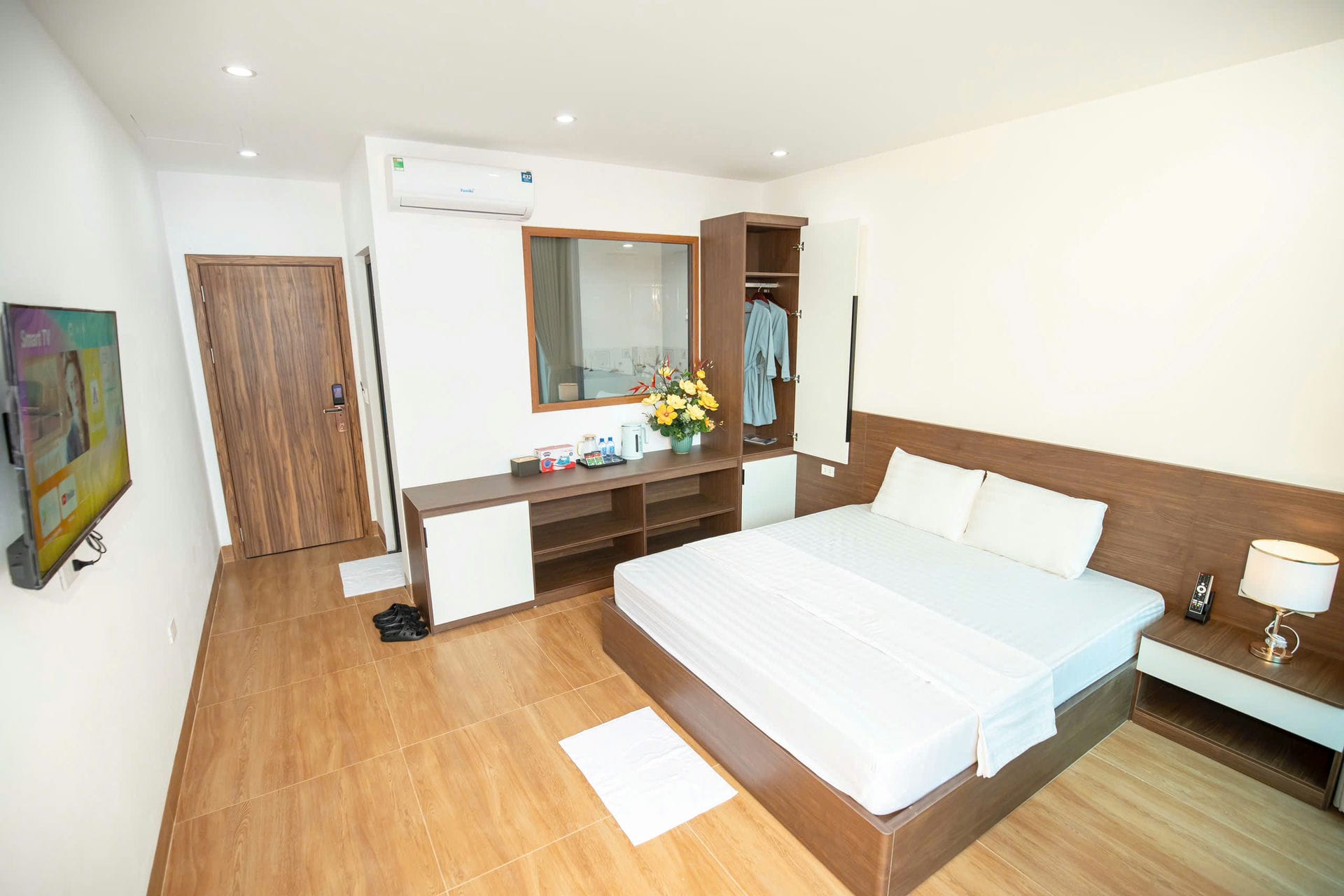 Phòng đơn tại Diamond Hotel được thiết kế dành riêng cho những du khách muốn tìm kiếm một không gian yên tĩnh và riêng tư. Với lối thiết kế tinh tế, mỗi phòng đều mang đến cảm giác ấm cúng và thoải mái, giúp bạn thư giãn sau một ngày dài khám phá. Đặc biệt, phòng có ban công riêng, nơi bạn có thể tận hưởng làn gió biển mát lành và ngắm nhìn cảnh quan tuyệt đẹp của Flamingo Hải Tiến. Đây chính là lựa chọn hoàn hảo cho những ai yêu thích sự tinh giản mà vẫn muốn tận hưởng đầy đủ tiện nghi đẳng cấp.